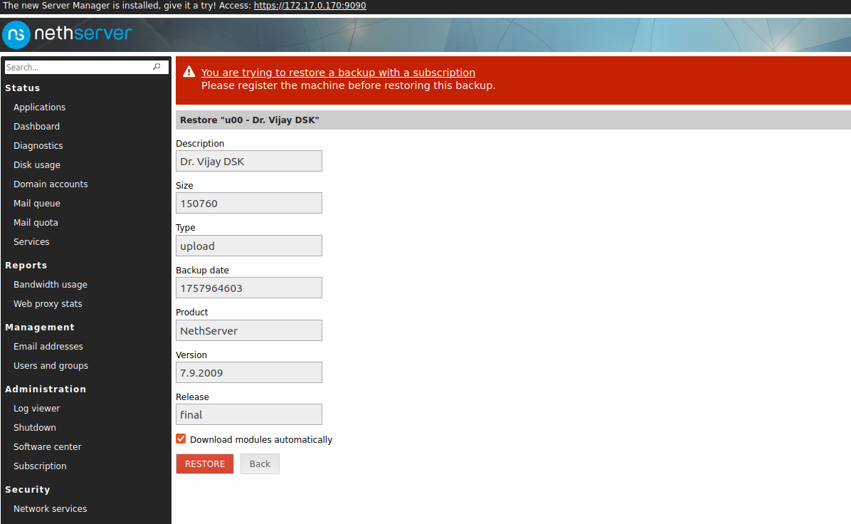 Note: I have removed the subscription from the production server and VM also. Created a new backup and tried to restore with download modules automatically and without download modules automatically.