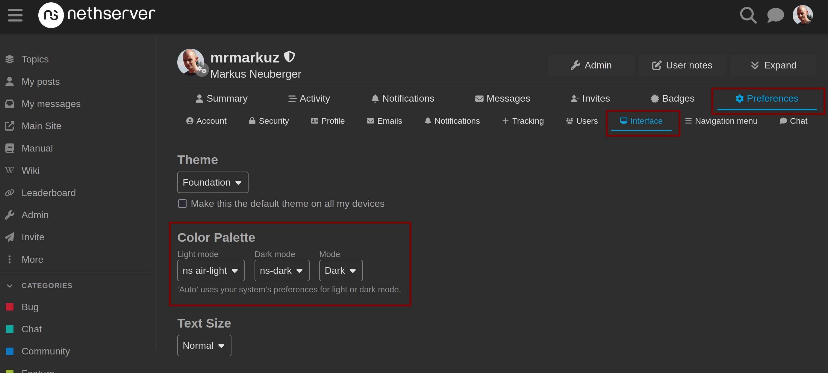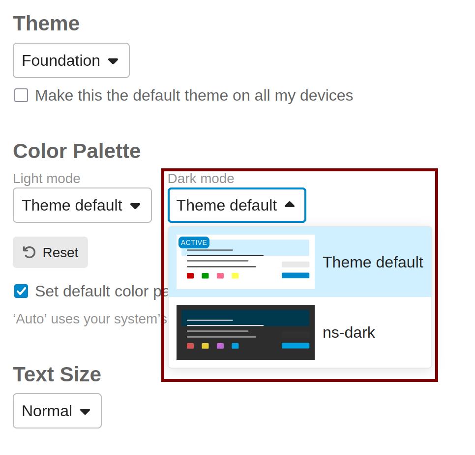 When I select another Dark mode theme than the “Theme default”, another dropdown (“Mode”) appears: