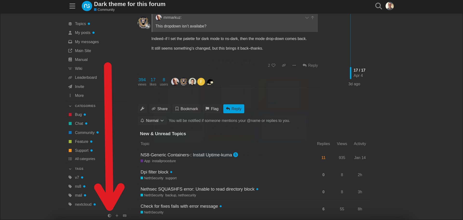See Explanation of dark mode, how to select it, and how to enable switching - Users - Discourse Meta