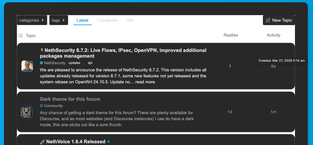 Any chance of getting a dark theme for this forum? There are plenty available for Discourse, and as most websites (and Discourse instances) I use do have a dark mode, this one sticks out like a sore thumb.