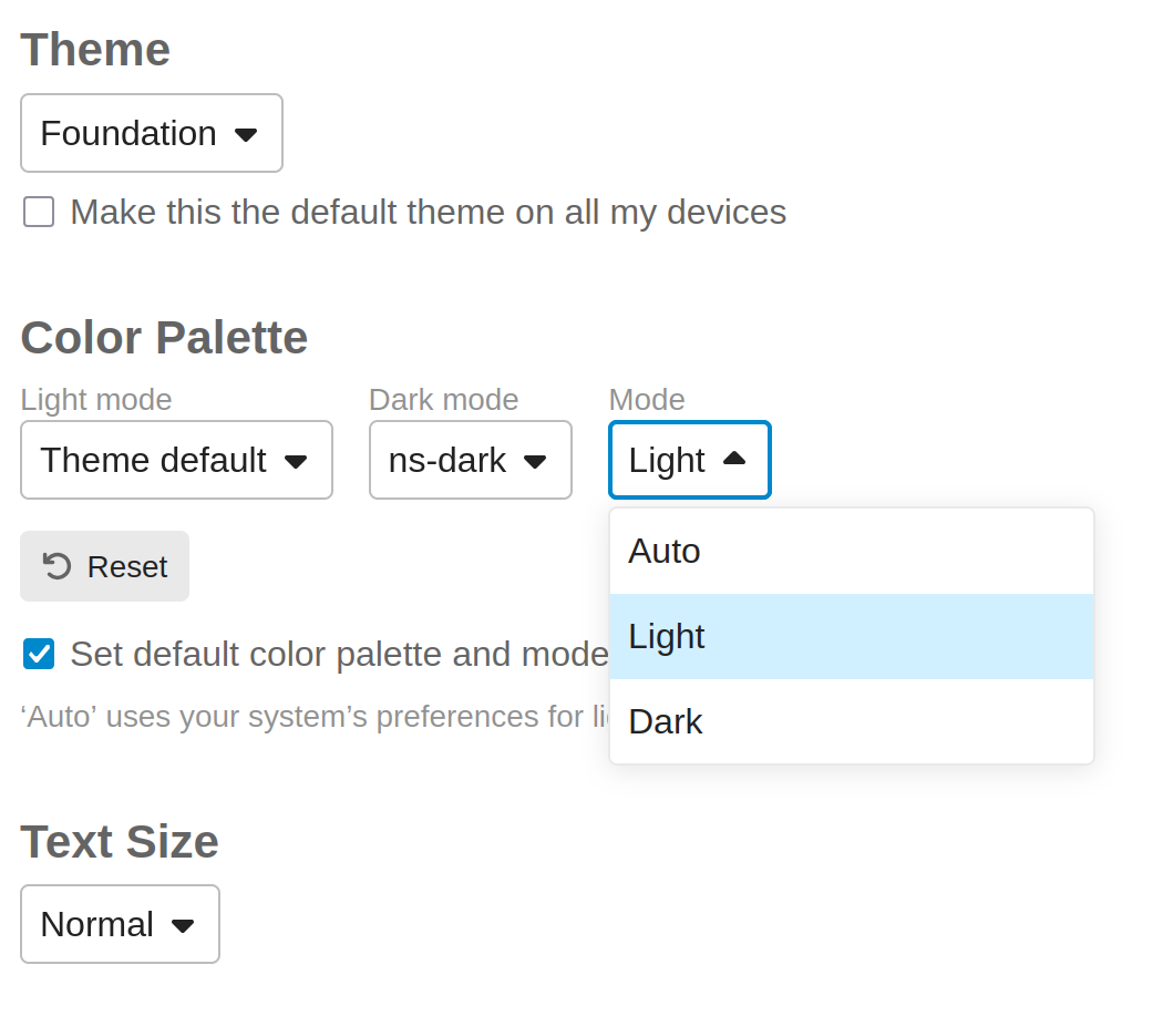But the light/dark mode dropdown isn’t available any more, at least for me, with the Foundation theme: