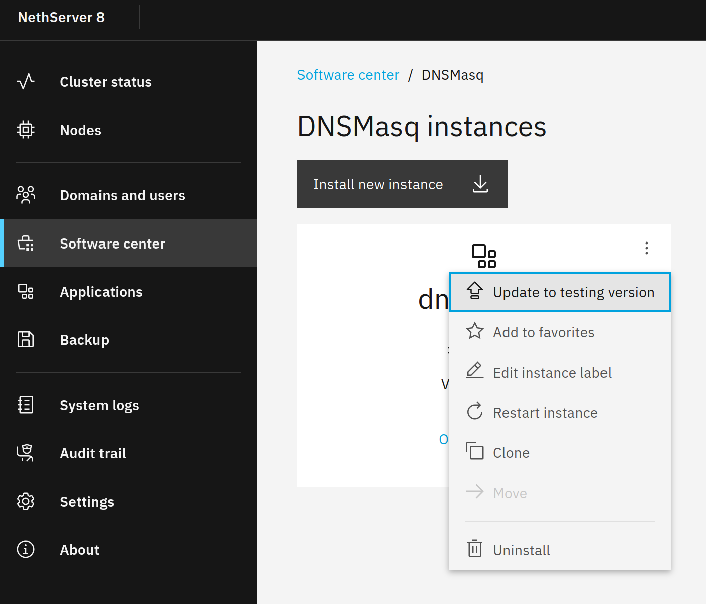 …or to upgrade to the testing version from Software Center or from CLI: (adapt dnsmasq1 to your dnsmasq instance)