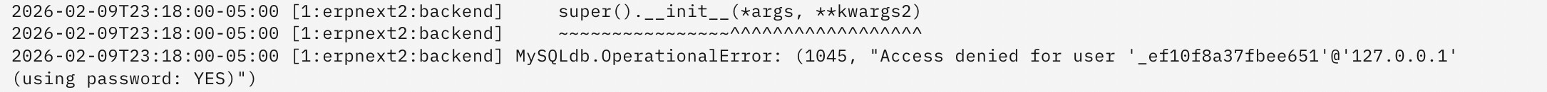 Once this was done, we had our second breaktrhough which was that now 2026-02-18T15:27:06-05:00 [1:erpnext7:backend] MySQLdb.OperationalError: (1049, "Unknown database '_0e2779d88f97ac76'")