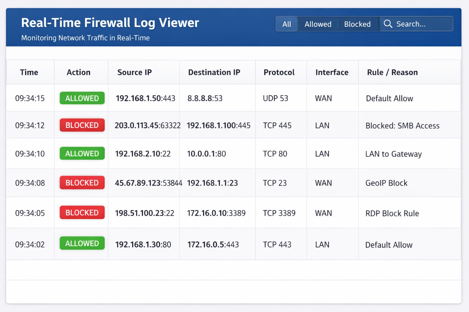Basically, I want to be able to see traffic and drops happening live, without needing to set up Grafana + Loki, Graylog, or some other external rocket science solution just to figure out who’s naughty and who’s nice.