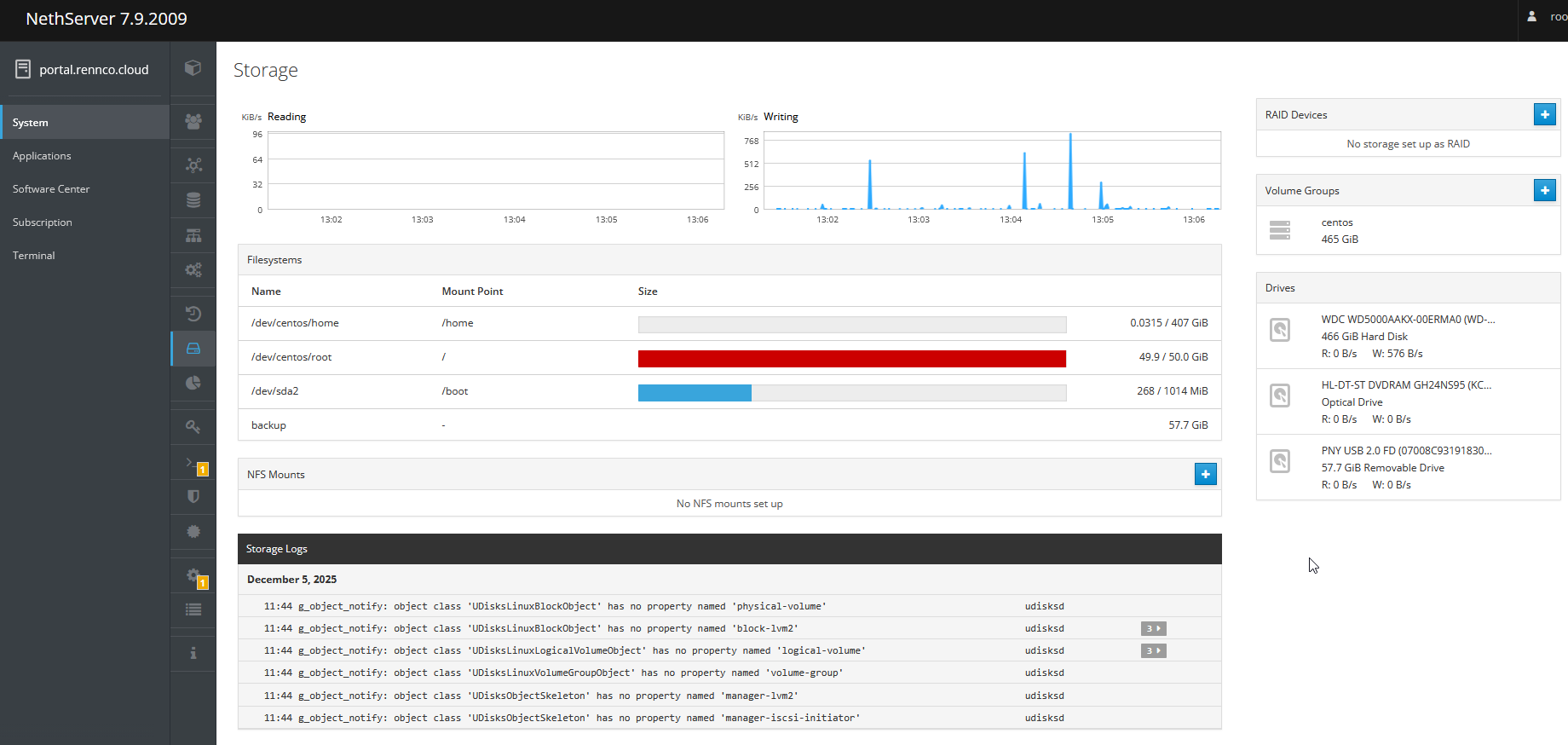 Well, it’s working after doing Markus’ suggestions. If it ain’t broke…However, when I go to storage in NS7 Cockpit’s System config, then try to add an LV, the most it will let me add is 4MB.Would I need to get rid of the /Home volume to free up more, then add it to the / (root) volume? I plan on going to a Nextcloud install on an NS8 VM, on Proxmox, first part of ‘26, so I’m just needing to get by until then. That’s provided those installs go smoothly and I get them running sooner than later. I’d rather not mess things up in the meantime. Thanks for the input tho.