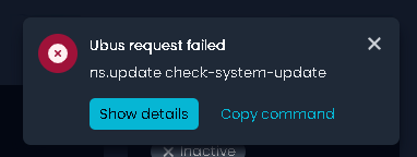 I restarted the computer and logged back into the web interface. I also tried to update it using the command that fails via ssh, but without luck: /usr/libexec/rpcd/ns.update call check-system-update