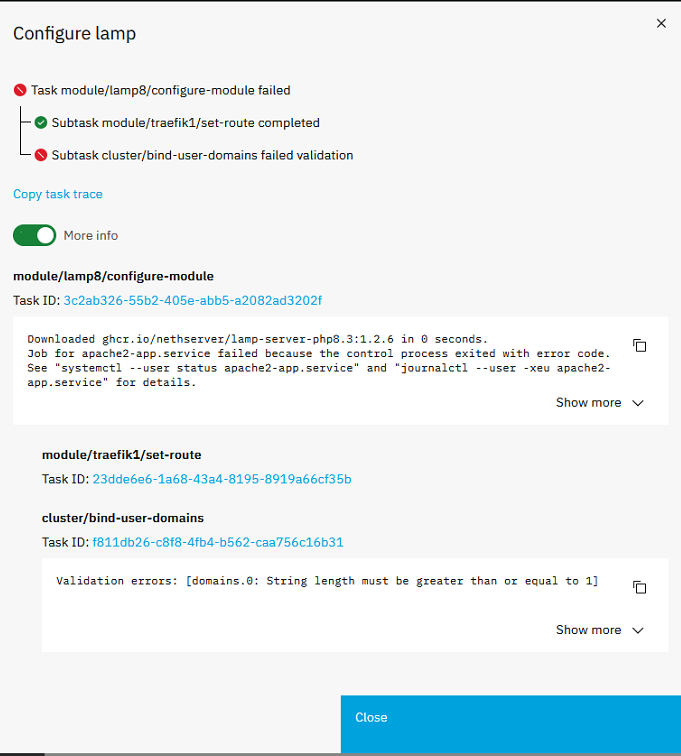 Are there errors in the logs after restarting lamp? See System logs — NS8 documentation how to access the logs.