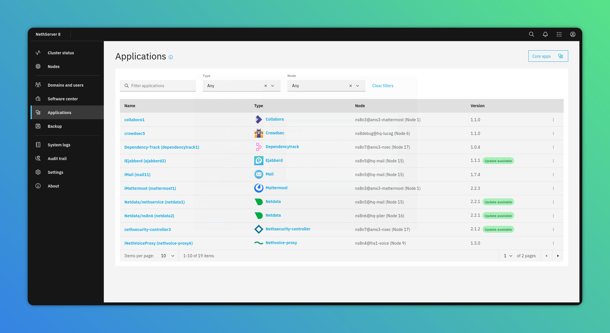 A new Applications page centralizes information about installed applications: where they run, their type and version, and available actions. It offers a clearer overview of the cluster’s software layout and simplifies navigation between applications.