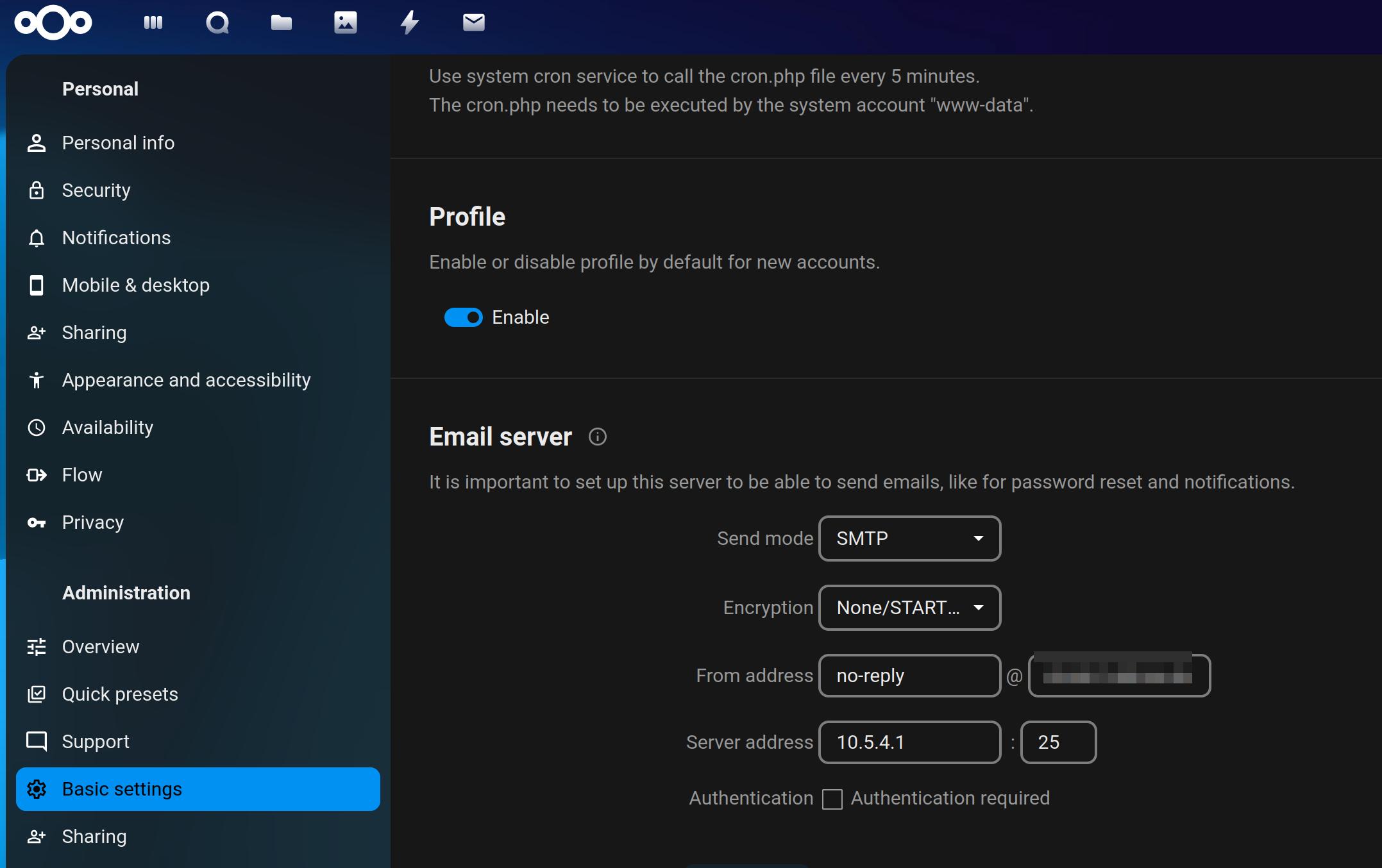 the hostname that’s always dispalyed in the sender address is my ddns hostname mydomain.ipv64.net and when i change it to the correct values of my ionos mailbox cloud@myionosdomain (and save it), it isn’t saved as the config file remains unchanged (with the above values which are correct). And i don’t use no-reply, as you can see above in the config.php snippet, i use cloud@myionosdomain. Even with the correct values i get the error, and when i log out and log in again, it’s reset to the values in the screenshot above (no-reply@mydomain.ipv64.net).
