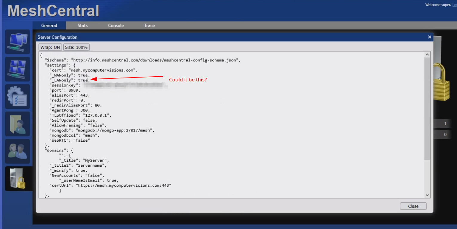 I tried to change it in MeshCentral… that didn’t work. If that is the problem? How do I get in to the docker and change those to false?