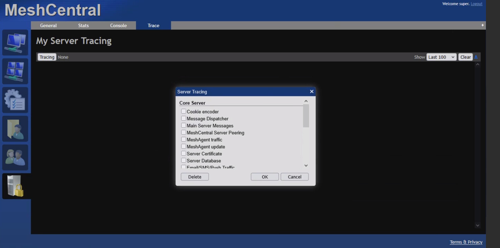 I am guessing I would do the trace here in MeshCentral. If so I am not sure what to select to be able to do the correct trace…