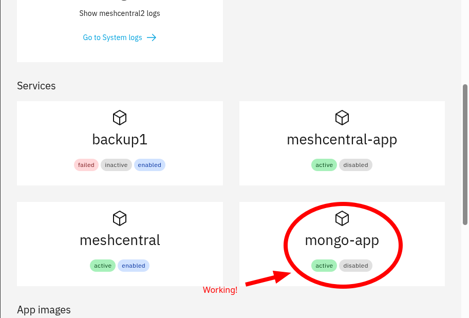 As you can see above, the meshcetnral app is inactive and disabled, as well as the mongo-app.
