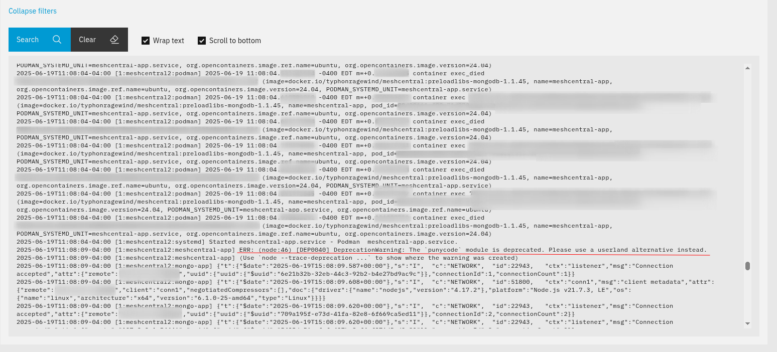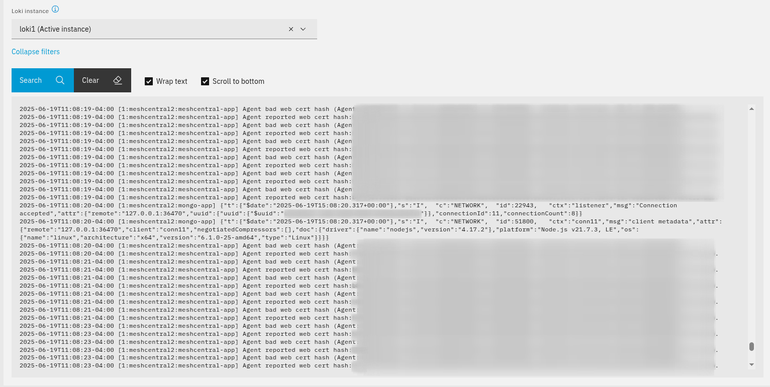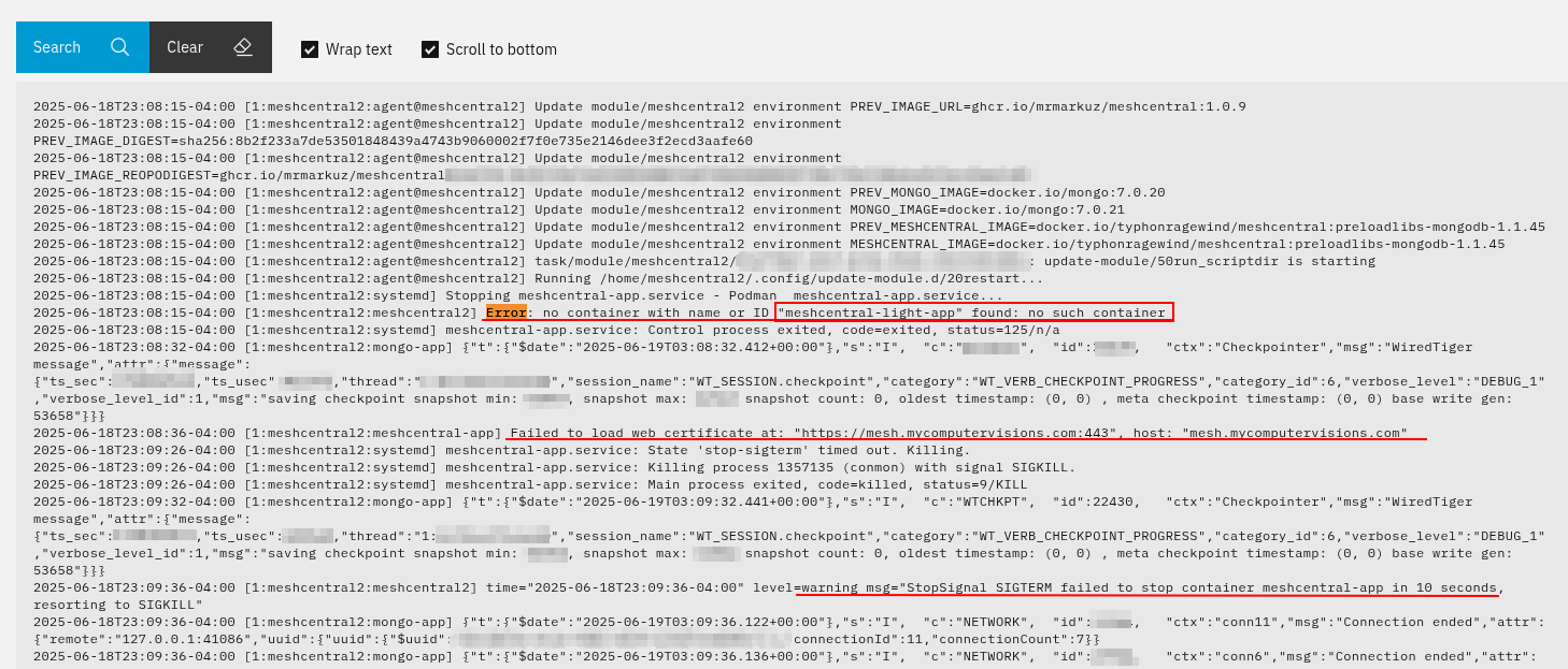 So I did the update to 1.0.11. Here is what I am getting now in the logs for MeshCentral. I still don’t see they connection between pc and MeshCentral. (all pc’s are greyed out) I am still unsure what to do next. But it looks like it may have something to do with the web cert. per logs… of course I am not sure. Still need others help on this one…