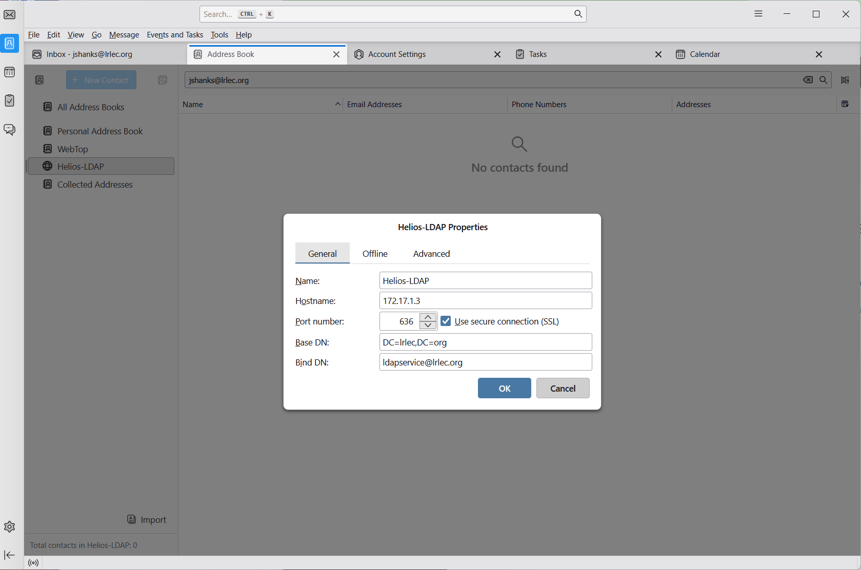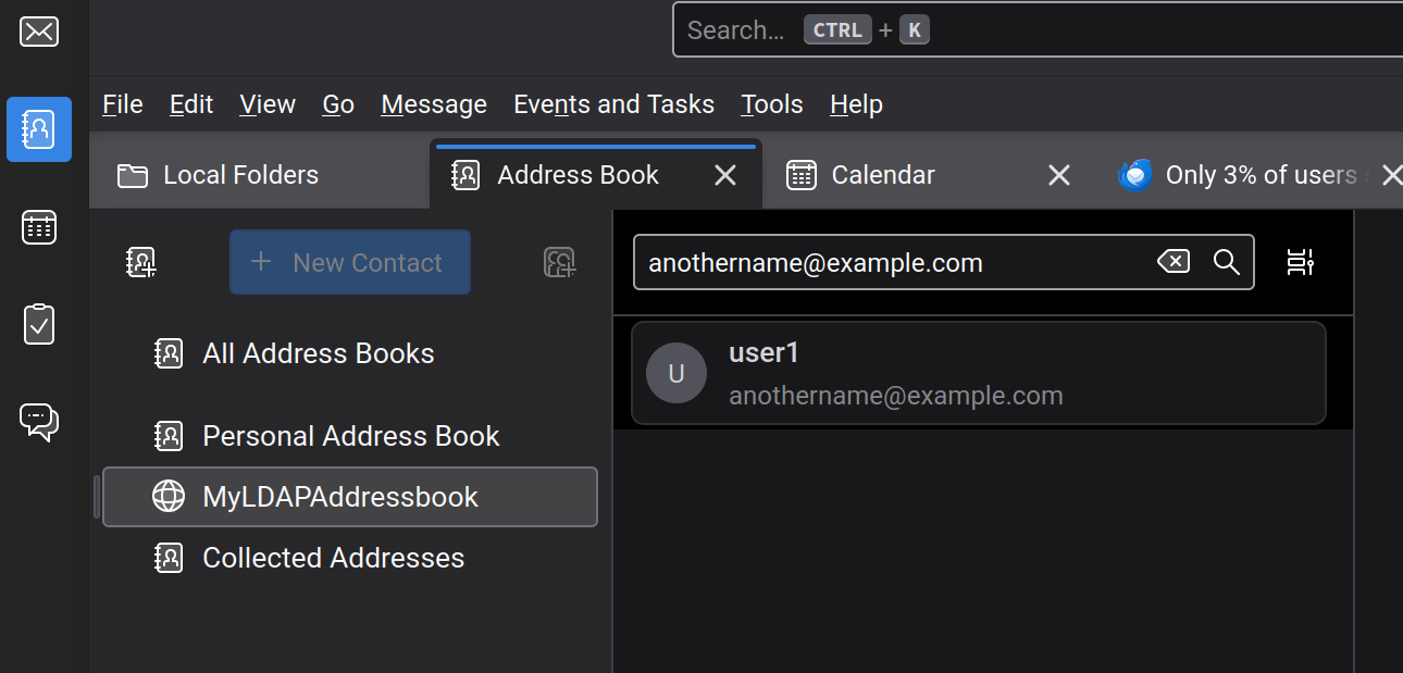 One other thing, I’m currently using a CardDAV connection withing Mozilla Thunderbird to the WebTop address book to sync contacts. It would be handy if that CardDAV connection would also present all addresses. I’ve been working on doing an LDAP connection to the Samba user database from within Thunderbird, but I’m not getting it to work.