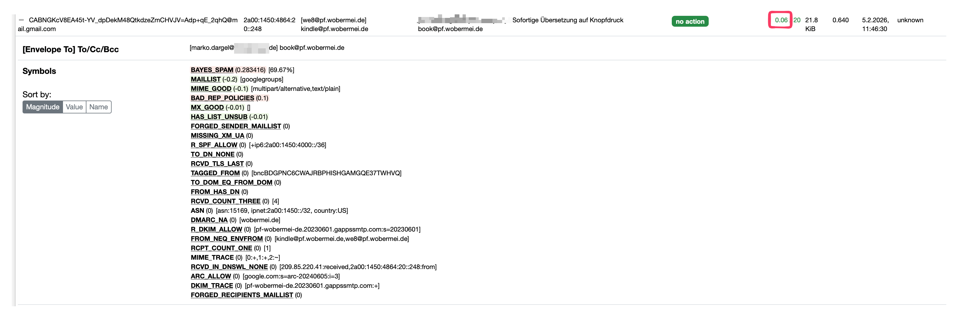 Reason: I am increasingly receiving spam emails that have a spam score of less than 5 or even less than 1 and are evaluated as HAM by rSpamd.