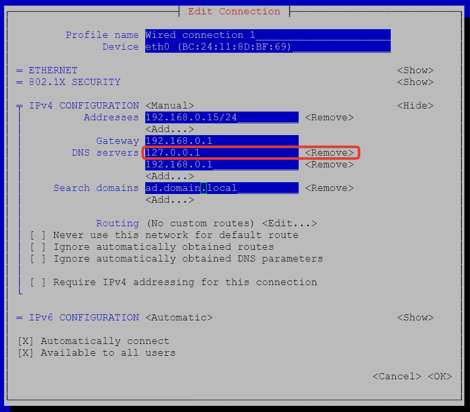 Please also remove 127.0.0.1 in nmtui, else it will reappear at next network restart.