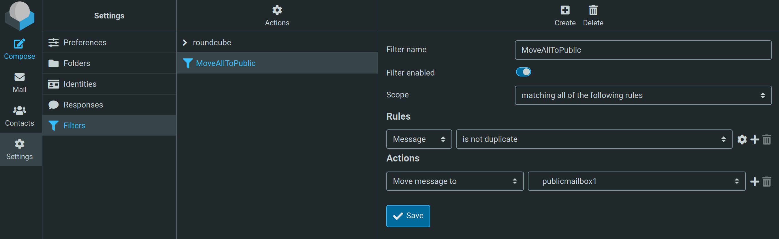 In Roundcube I created a sieve filter for the fetchinguser to move all mails that are no duplicates to the publicmailbox1: