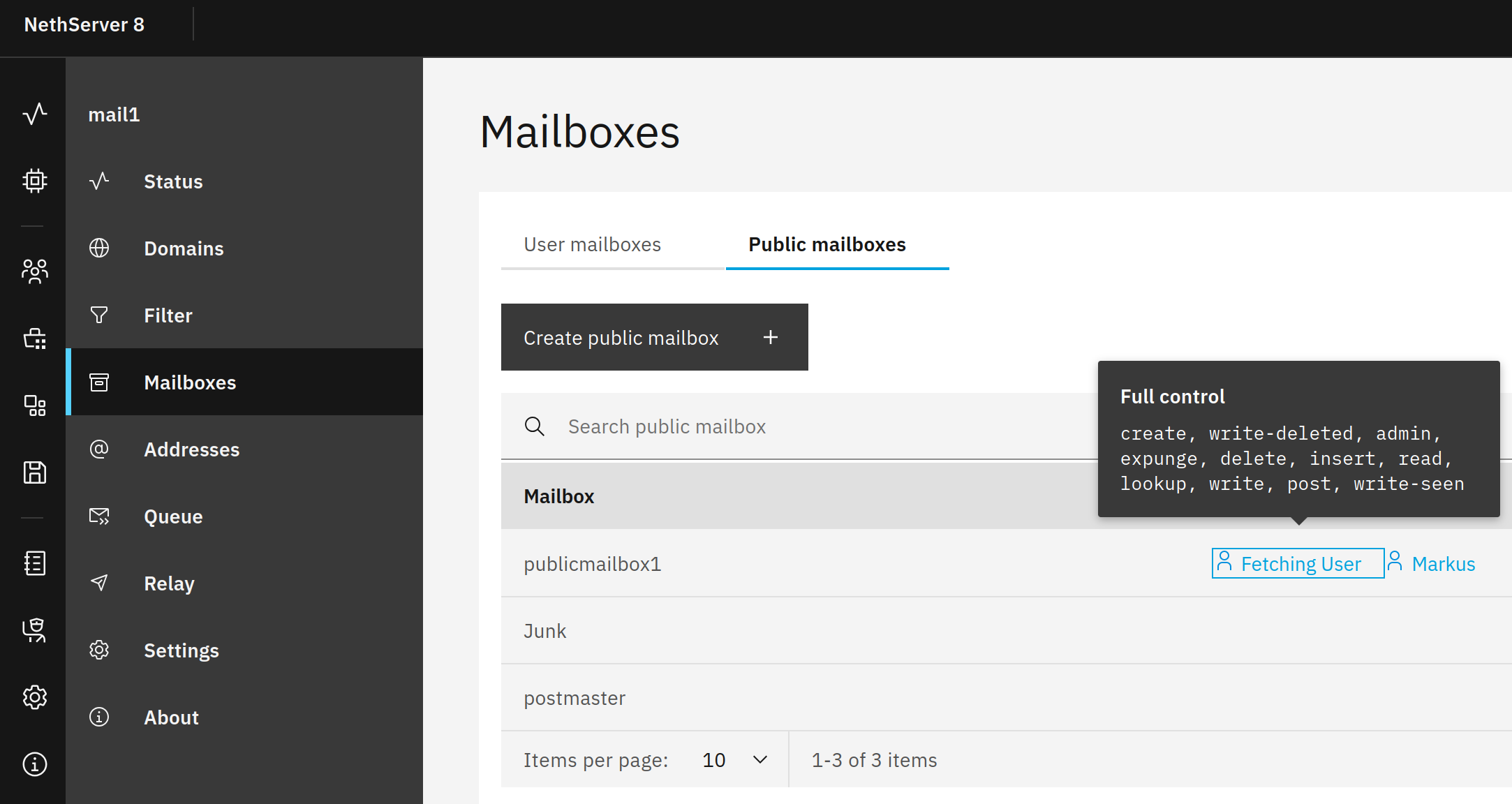 I created a user fetchinguser which is granted access (full control) to the public mailbox “publicmailbox1”: