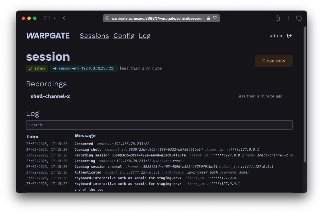 Warpgate directly exposes native SSH, HTTPS, MySQL and Postgres listeners, handling Authentication, and then transparently forwards the connection to the target server, while making a live recording for auditing.